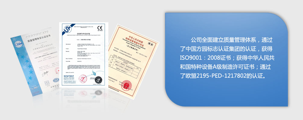 品質(zhì)是企業(yè)生存的基礎(chǔ),也是通向市場(chǎng)的基石,優(yōu)質(zhì)的產(chǎn)品是一個(gè)成功的企業(yè)對(duì)自身嚴(yán)格的要求,和對(duì)用戶(hù)的堅(jiān)持的關(guān)注,我們始終本著以“管理就是效益,產(chǎn) 品就是我們?nèi)似?rdquo;的經(jīng)營(yíng)宗旨,自04年開(kāi)始...致力于質(zhì)量管理工作,并先后取得了由中國(guó)方圓標(biāo)志認(rèn)證集團(tuán)頒發(fā)的ISO9001:2008質(zhì)量體系認(rèn)證證書(shū)、江 蘇質(zhì)量局頒發(fā)的計(jì)量保證確認(rèn)證書(shū)、歐盟2195-PED-1217802(歐盟承壓設(shè)備指令)產(chǎn)品認(rèn)證證書(shū)、國(guó)家質(zhì)檢總局頒發(fā)的A級(jí)壓力管道元件制造許可 證等。
